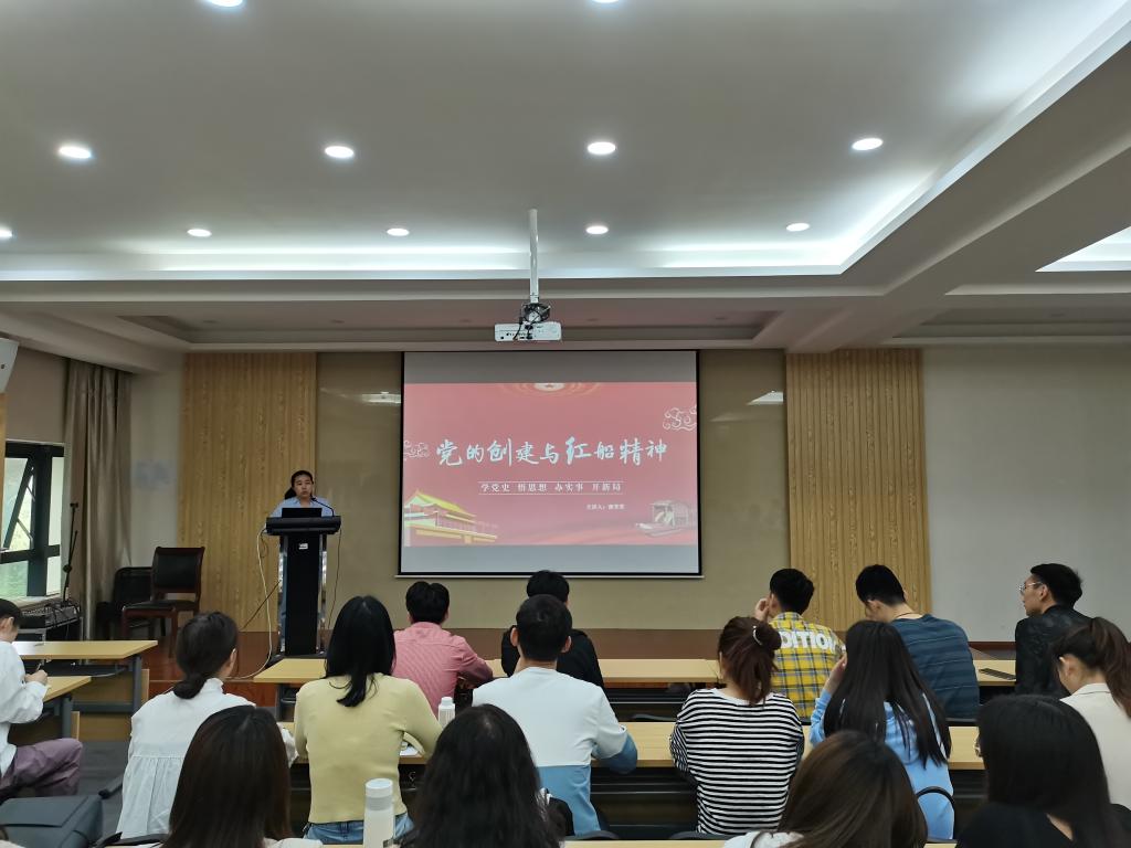 学生工作办公室主任、团委书记谢菲菲在J9-433面向学院研究生做了题为《党的创建与红船精神》的党史宣讲。