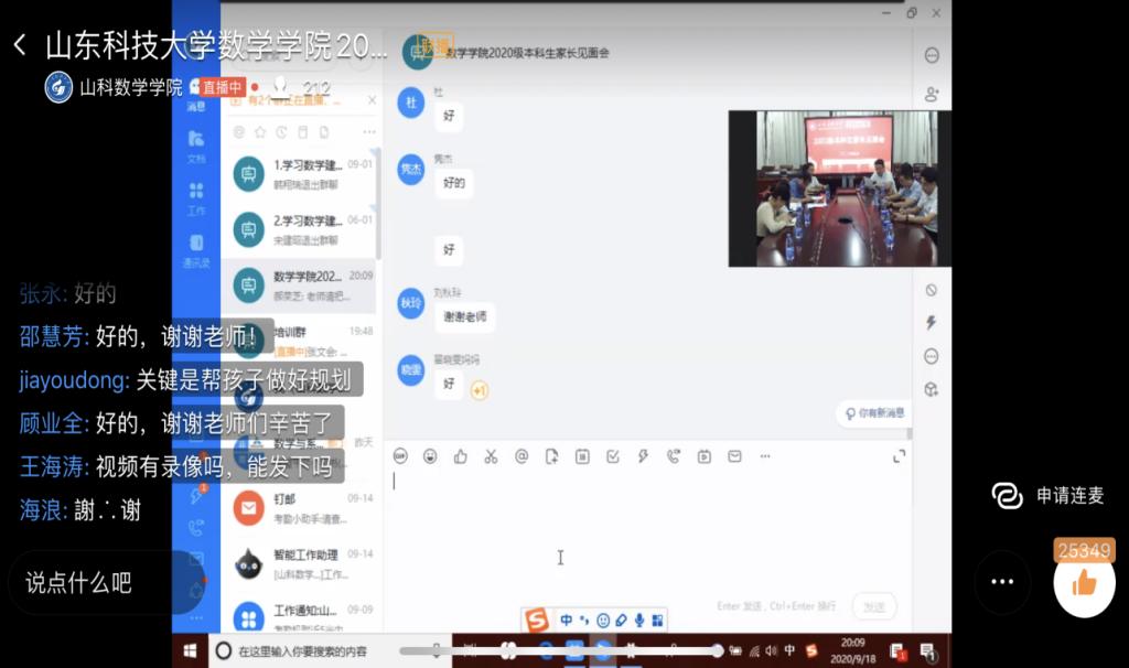 超越距离,“云”上见面。9月18日晚,91短视频 在J9-425会议室举办2020级新生家长“云”见面会。学院党委副书记刘辉,副院长张同迁、杨红卫、方泳,团委书记谢菲菲,2020级新生辅导员及200余名新生家长参加会议。会议由刘辉主持。