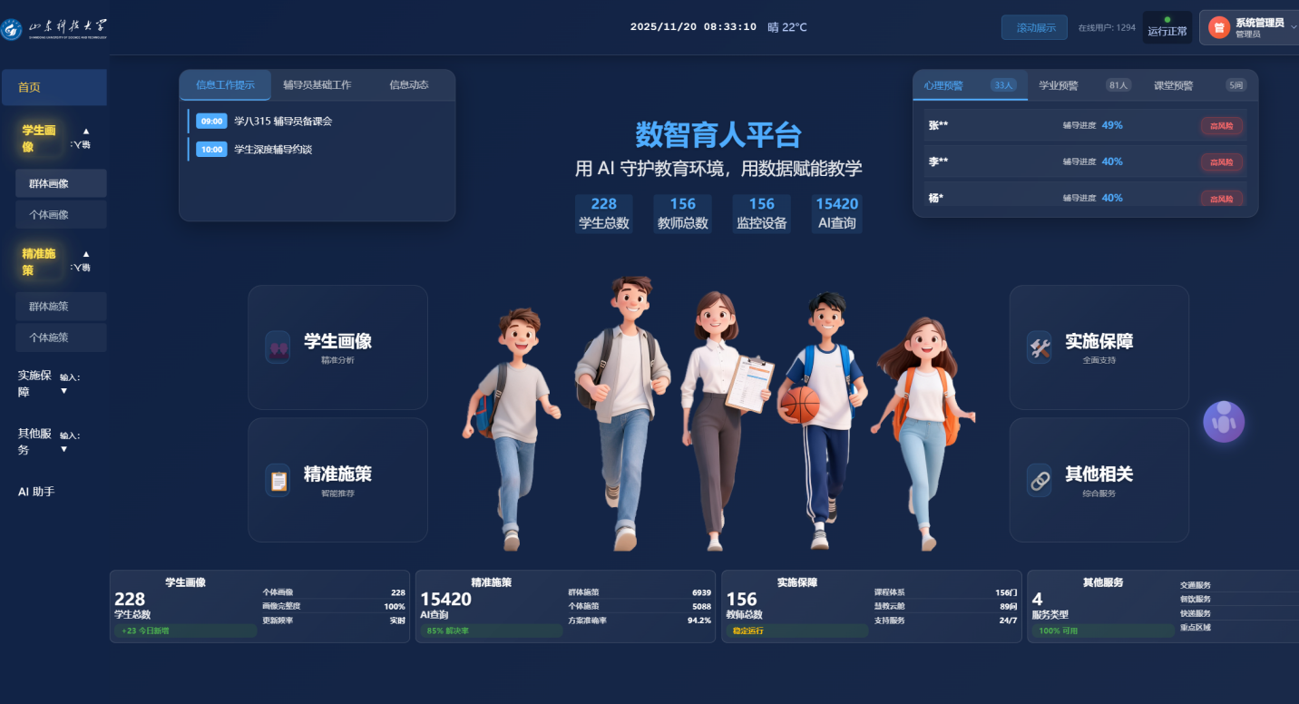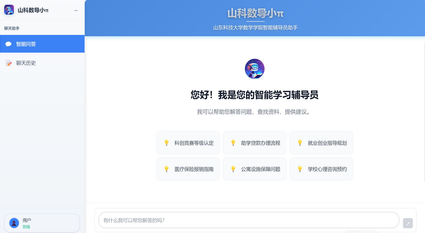智能服务效能升级。2025年,学院率先在学校推出“山科数导小π”AI辅导员智能体,覆盖学业咨询、生活服务、心理疏导、就业指导等高频需求场景,实现“一键查询、秒级响应、智能解答”的精准服务功能,累计服务学生1500余人,日均访问量超50人次。数智育人平台已完成基础框架搭建与核心模块开发,进入试运行与迭代优化阶段,为学生成长提供持续的智慧化支撑。